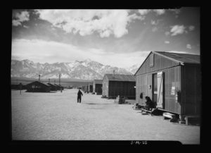 We open with a discussion about Manzanar, a California camp where Adams and Lange took many photos, and where there were brief uprisings by the prisoners.  The opening music, by Looters, is called “Manzanar”.  The Ansel Adams photo below is of Manzanar.